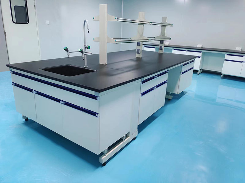 钢木中央实验台整体承重采用工字型钢架结构,柜体采用环保E1级18mm双饰面实木三聚氰胺板材制作边缘采用pvc防水处理,台面采用12.7mm实心理化板台面耐酸碱 耐腐蚀且不易变形等优点,实验台可配置水槽水龙头、试剂架、洗眼器、滴水架等设备